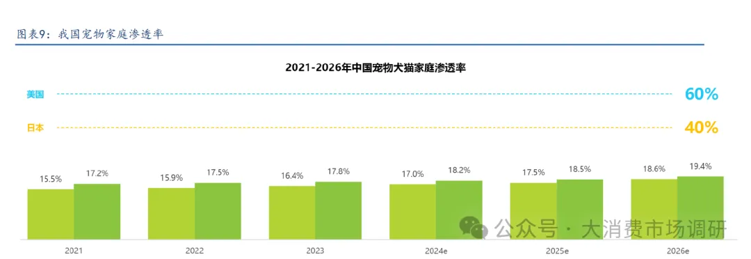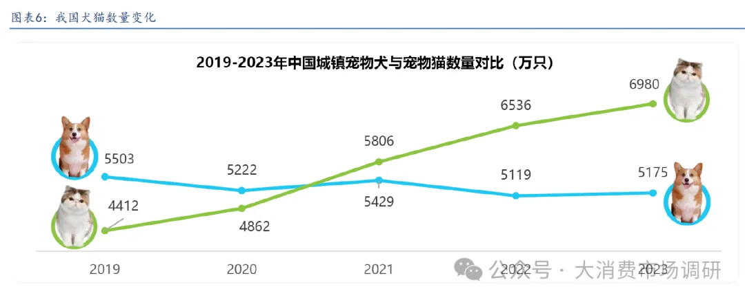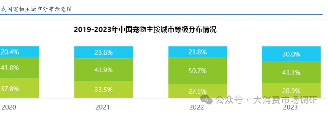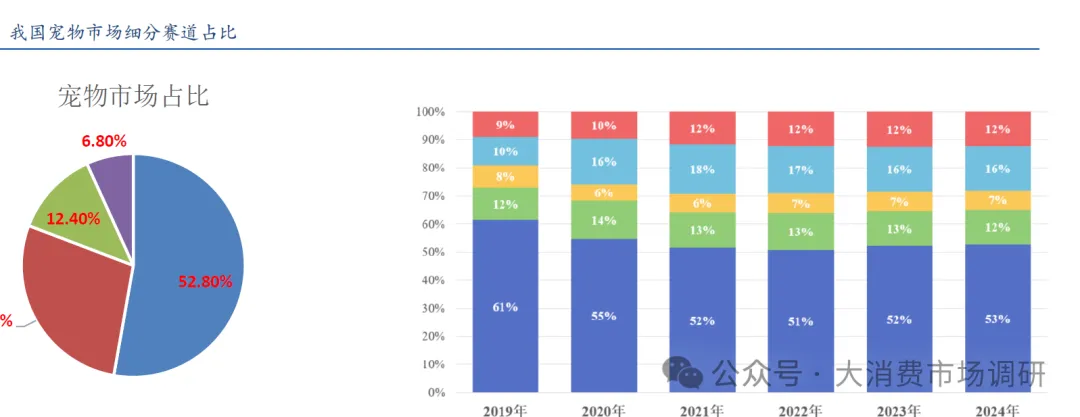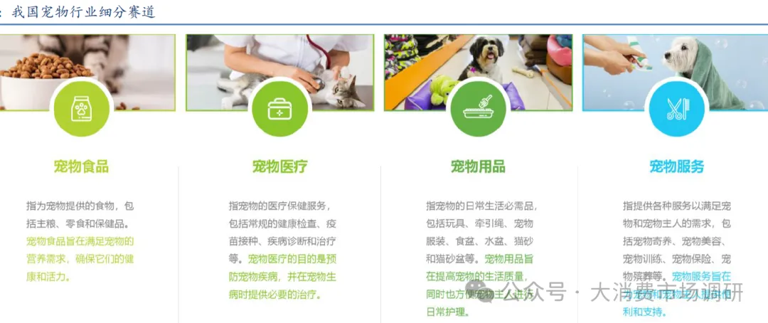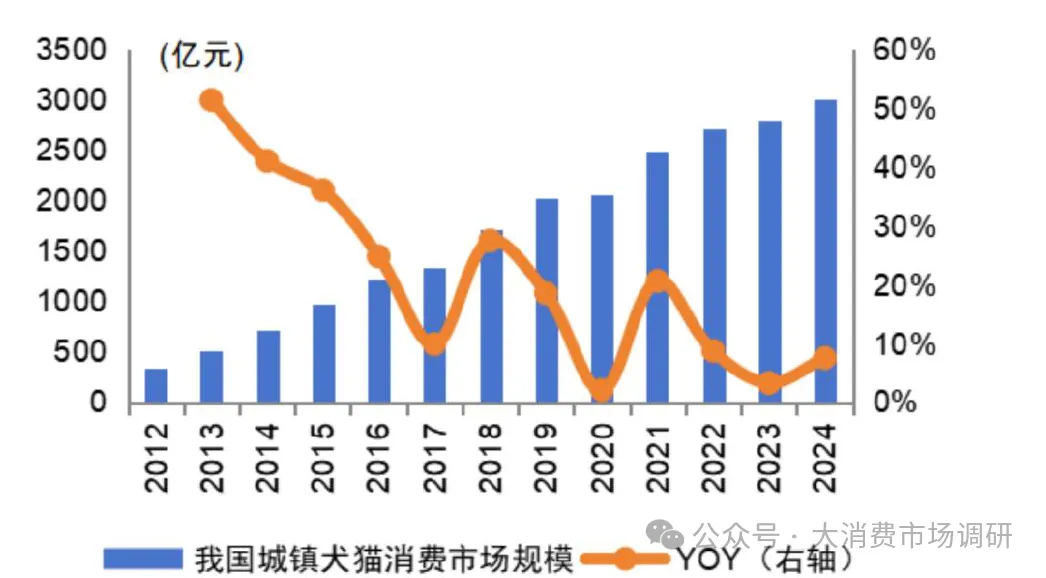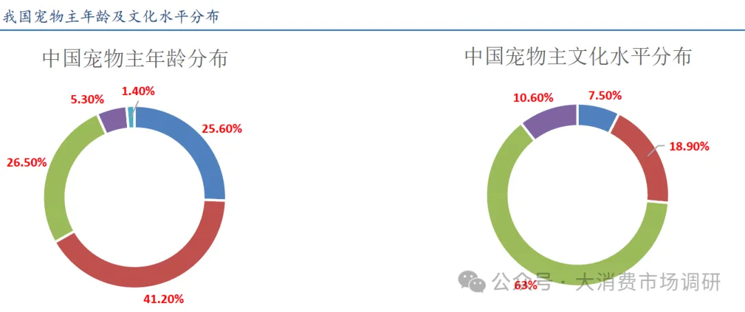 · 寵物貓數(shù)量連續(xù)四年超過(guò)寵物狗數(shù)量:1、寵物貓的獨(dú)立性較強(qiáng),不需要想寵物狗一樣外出散步;2、由于通常寵物貓食量小于寵物狗,經(jīng)濟(jì)負(fù)擔(dān)較??;3、寵物貓的體型較小,適合現(xiàn)在城市的住宅特點(diǎn); 2024年我國(guó)城鎮(zhèn)寵物(犬貓)消費(fèi)市場(chǎng)規(guī)模達(dá)到3,002億元,比2023年增長(zhǎng)7.5%,規(guī)模持續(xù)穩(wěn)定增長(zhǎng)。2012-2024年復(fù)合增長(zhǎng)率為20%。隨著寵物家庭滲透率和行業(yè)成熟度的持續(xù)提升,我國(guó)寵物行業(yè)市場(chǎng)規(guī)模呈現(xiàn)穩(wěn)步上升的態(tài)勢(shì)。 根據(jù)相關(guān)數(shù)據(jù)進(jìn)行測(cè)算,2023年國(guó)內(nèi)寵物犬家庭滲透率約為17.8%,預(yù)計(jì)2026年將達(dá)到19.4%; 2023年國(guó)內(nèi)寵物貓家庭滲透率約為16.4%,預(yù)計(jì)2026年將達(dá)到18.6%。目前國(guó)內(nèi)寵物滲透率與美國(guó)等成熟寵物市場(chǎng)相比,存在約3倍的差距;與泰國(guó)、日本等與國(guó)內(nèi)思想理念和居住環(huán)境相近的國(guó)家相比,也存在2倍的差距。 寵物主畫(huà)像:多為高學(xué)歷、高收入,近六成是企業(yè)白領(lǐng);年齡以90后、95后、00后群體已經(jīng)成為消費(fèi)主力,成為了寵物經(jīng)濟(jì)強(qiáng)勢(shì)崛起的關(guān)鍵,而高學(xué)歷、高收入的寵物主又帶動(dòng)了寵物經(jīng)濟(jì)的快速發(fā)展。 寵物主畫(huà)像:從寵物主的城市分布來(lái)看,寵物主一線城市占比在近幾年呈現(xiàn)下降態(tài)勢(shì),而三線及以下城市則由2019年的20.4%提升至2023年的30%,原因可能在于:一方面,一線城市政府為了加強(qiáng)城市規(guī)范養(yǎng)寵而推出的更為嚴(yán)格的政策法規(guī)降低了部分居民的養(yǎng)寵意愿;另一方面,三線及以下城市居民的消費(fèi)能力提升帶動(dòng)了寵物主的增長(zhǎng)。 目前我國(guó)寵物行業(yè)主要?jiǎng)澐譃閷櫸锸称?、寵物醫(yī)療、寵物用品和寵物服務(wù)四大細(xì)分賽道,其中寵物食品定位于“為寵物提供必要營(yíng)養(yǎng)需求”,寵物醫(yī)療定位于“運(yùn)用醫(yī)療保健服務(wù)預(yù)防和治療寵物疾病”,寵物用品定位于“提高寵物生活質(zhì)量”,寵物服務(wù)定位于“為寵物和寵物主人提供便利和支持”。 2024年寵物食品消費(fèi)占我國(guó)城鎮(zhèn)寵物總消費(fèi)約 52.8%,寵物醫(yī)療市場(chǎng)份額為28%,市場(chǎng)規(guī)模約為800億,寵物用品、寵物服務(wù)市場(chǎng)份額較低,分別為12.4%和6.8%。