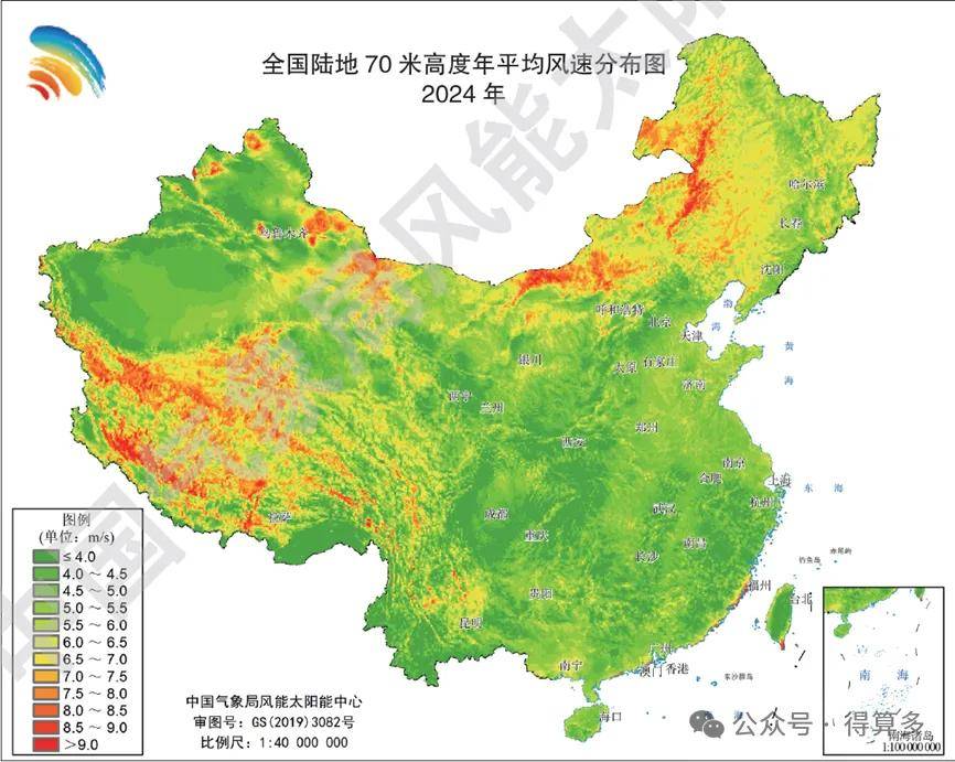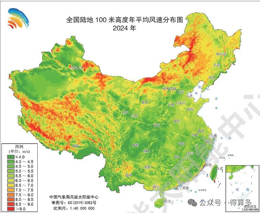 2024年全國陸地100米高度年平均風(fēng)速分布(單位:m/s)