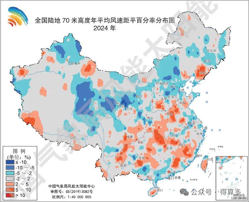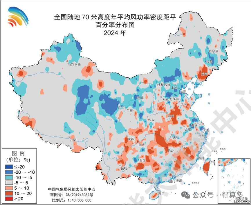 2024年全國陸地70米高度年平均風(fēng)功率密度距平百分率(單位:%)