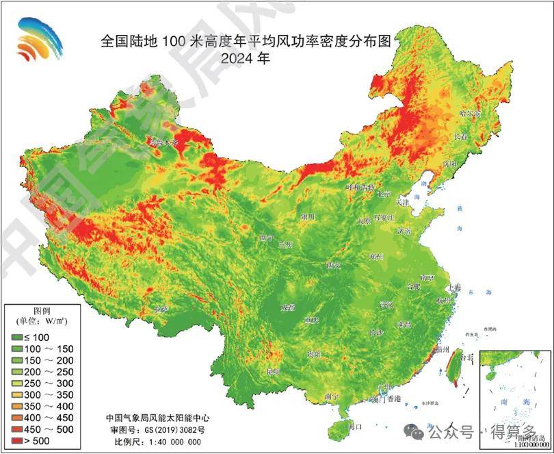2024年全國陸地100米高度年平均風(fēng)功率密度分布(單位:W/m2)